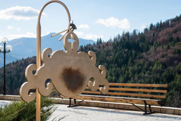 Trei rândunele mititele ţin sfat la uşa deschisă. După ce urci cele câteva trepte, te aşteaptă, reprezențați în mozaicuri de mărime naturală, Sfinţii Simeon şi Amfilohie de la Pângărați, învăluiţi în lumină. Deasupra uşii roșii-aurite, pelerinul poate citi pisania și privi stema Moldovei, dăltuită în piatră. Icoana Sfinţilor Români, ocrotiţi de Maica Domnului, realizată tot în mozaic e deasupra acestora.