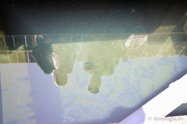 Aproximativ o mie de pești așteaptă să fie hrăniți și sar deasupra apei când Părintele Constantin le aruncă niște boabe negre din mâncarea lor specială. „Când mâncăm noi, le dăm și lor”, spune dânsul zâmbind. Până la toamnă vor intra trei într-un kilogram și cam atunci se vor și sacrifica. La 300 de grame, păstrăvul e un pește pe care un om abia îl mănâncă.